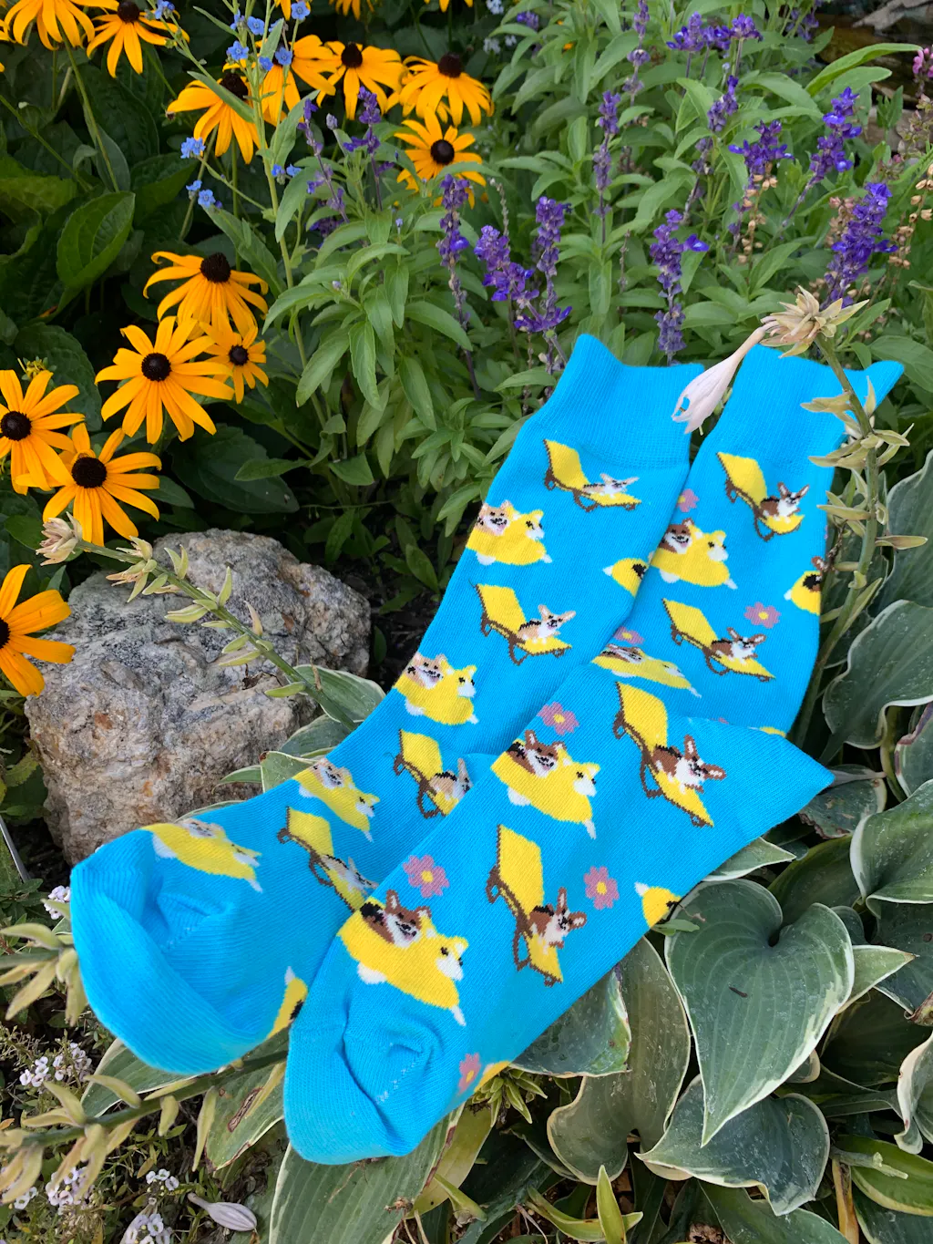 I love socks & corgis so these were a must have for my collection (plus we love Zero the Corgi!). The socks are well made (the designs are very clear, not messy) and I love how bright the blue is. Comfy to wear & have washed well (only been washed twice so far) without bleeding.