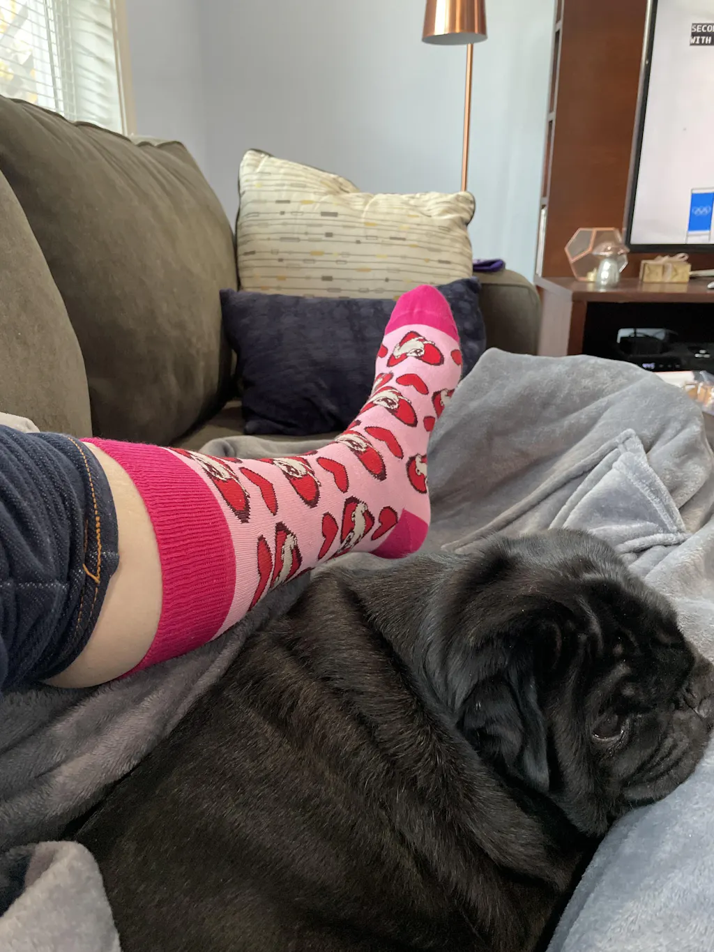I appreciate these and the pug Valentine socks I bought. But they come more than half-way up my calf! Who wears knee highs any more, which they are closer to than ankle socks? Charge the same price and make them ankle socks or better yet, no-shows. I bet you’d sell more. And black pug owners: demand equal time for black pugs!